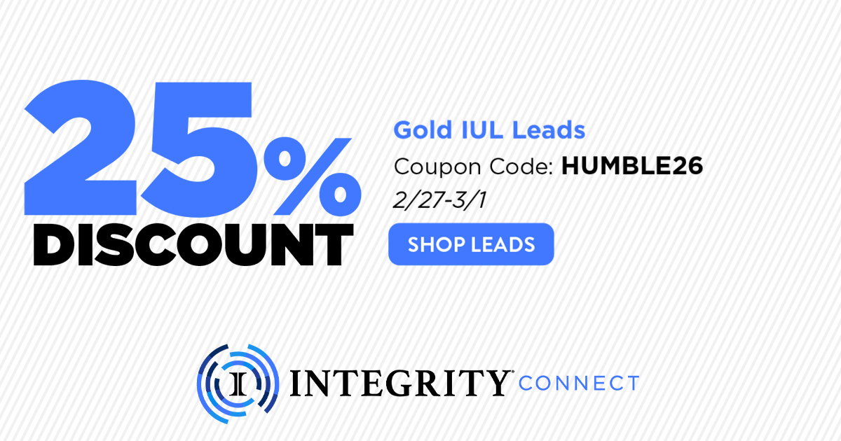 25% OFF Gold IUL Leads — only in IntegrityCONNECT Leads! Use code HUMBLE26 at checkout from February 27th until 11PM CT March 1st.